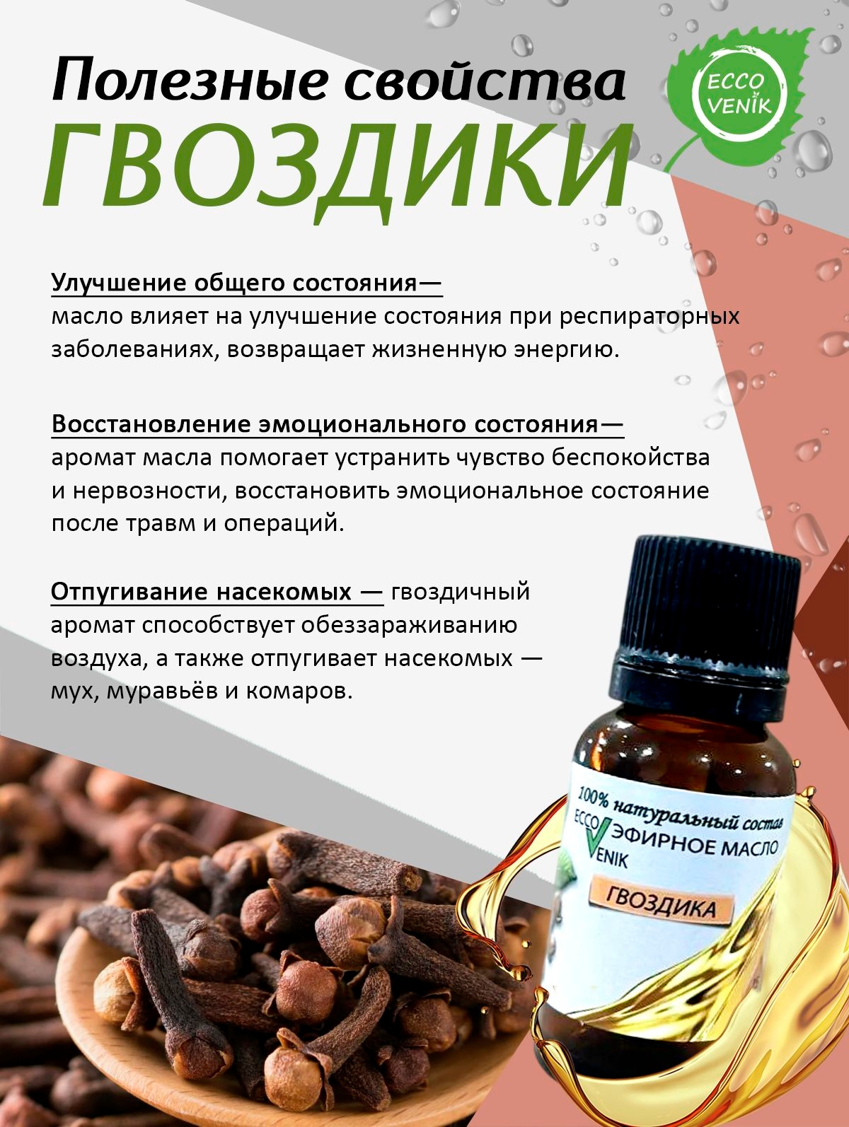 Дезинфекция: Используйте эфирное масло гвоздики для дезинфекции воздуха. Смешайте его с водой и распыляйте в помещении.