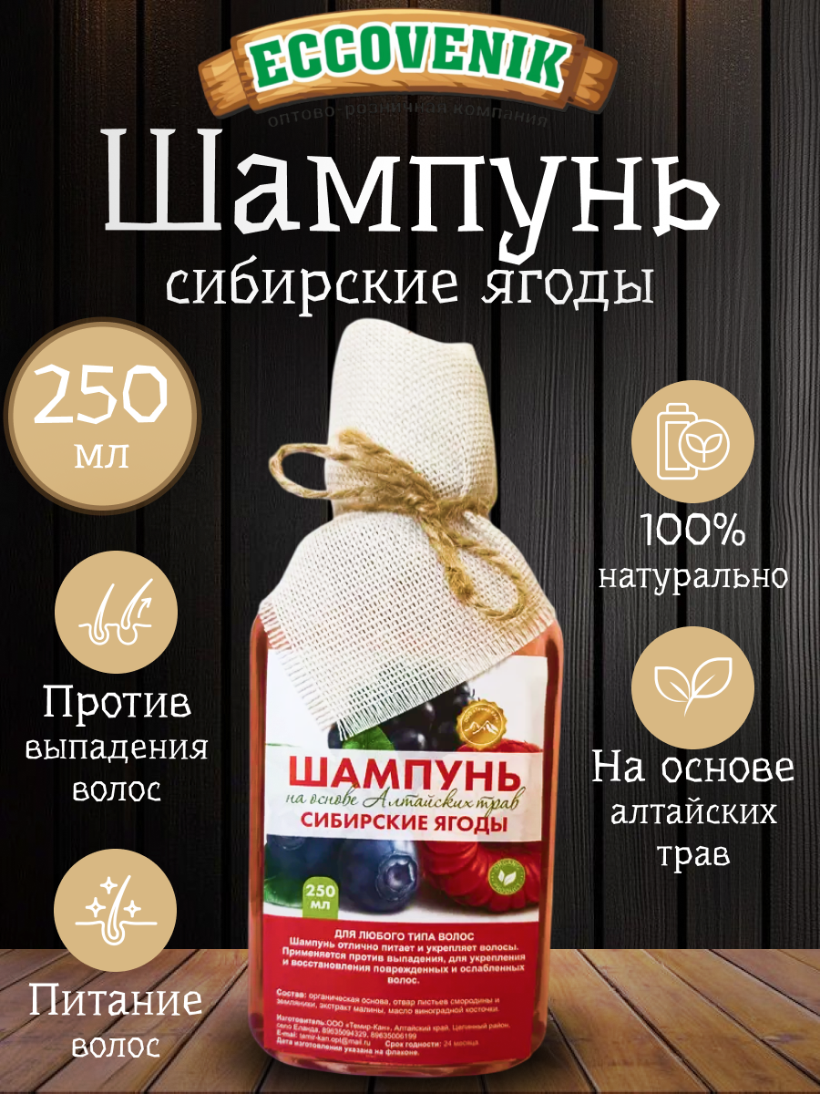 «Алтайский шампунь «Сибирские ягоды» – сила природы для ваших волос! - Глубокое питание и увлажнение благодаря натуральным экстрактам алтайских ягод; - Возвращает волосам здоровье, блеск и силу всего за несколько применений; - Безопасная формула без сульфатов и парабенов – забота о вашей красоте без вреда здоровью; - Изготовлен из экологически чистого сырья Алтая по традиционным рецептам! Испытайте силу сибирской природы вместе с нами!»